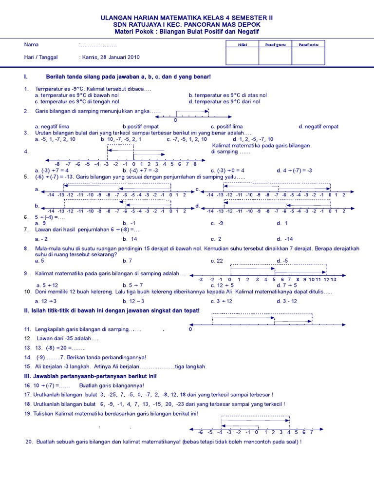 Soal Ulangan K 13 Matematika Kelas 6 Materi Pokok Bilangan Bulat