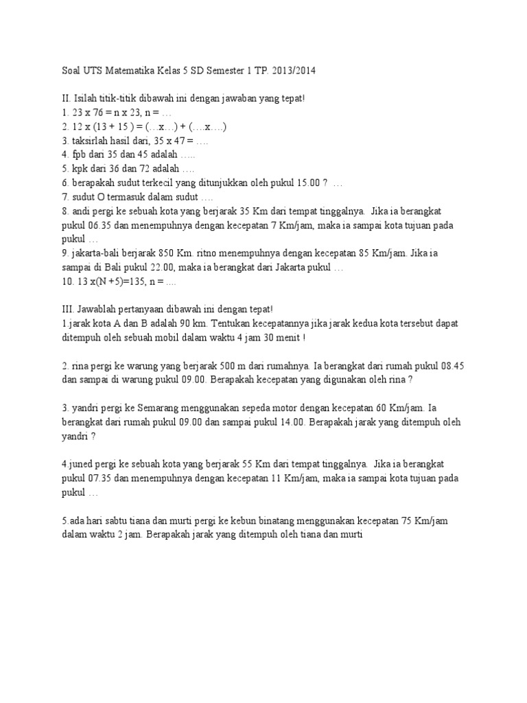 Soal Uts Matematika Kelas 5 Sd Semester 1 Tp