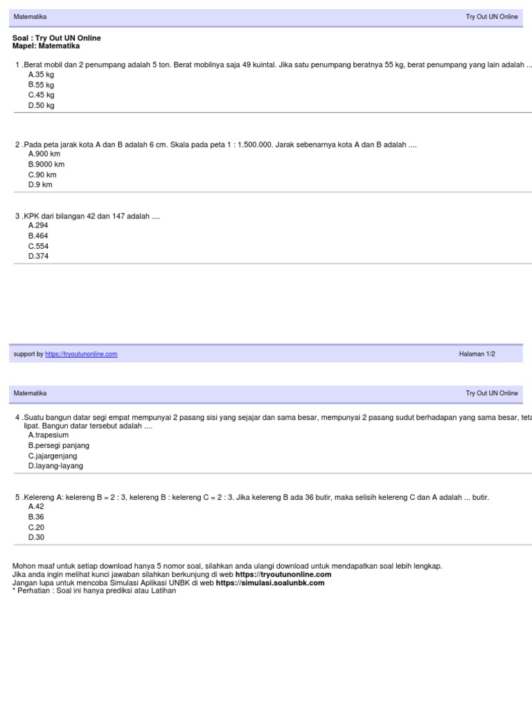 Soal Try Out Ujian Nasional Un Matematika Smp Mts Tahun 2020